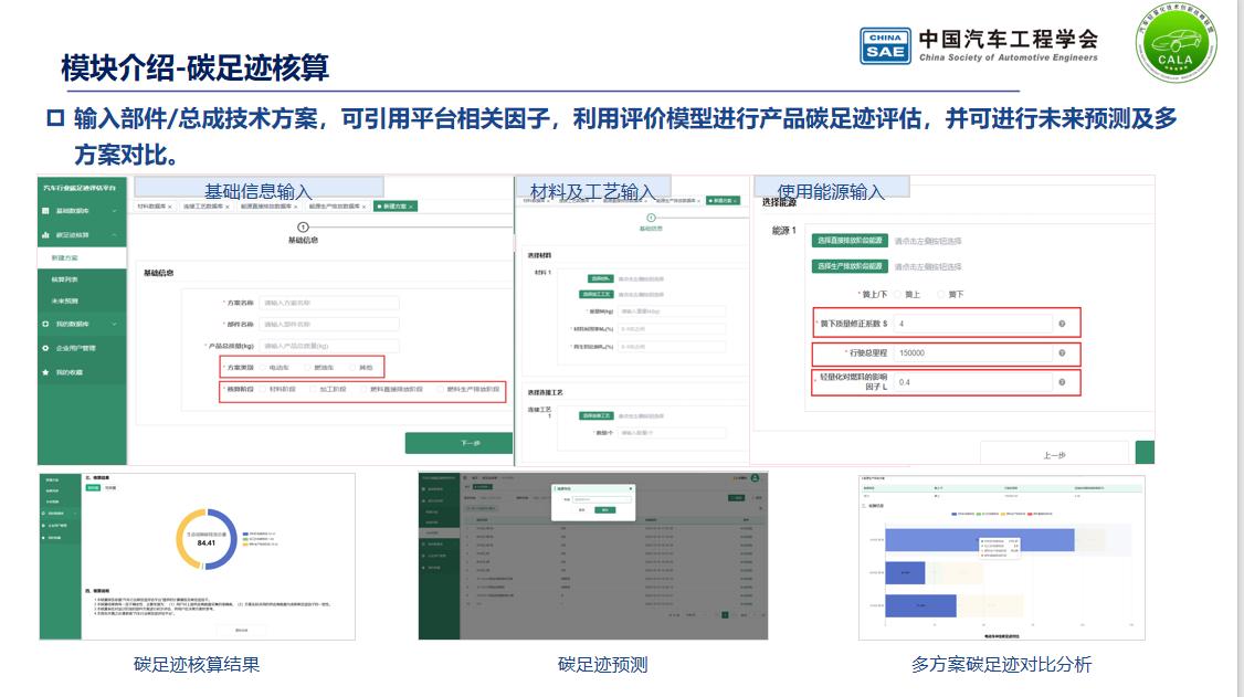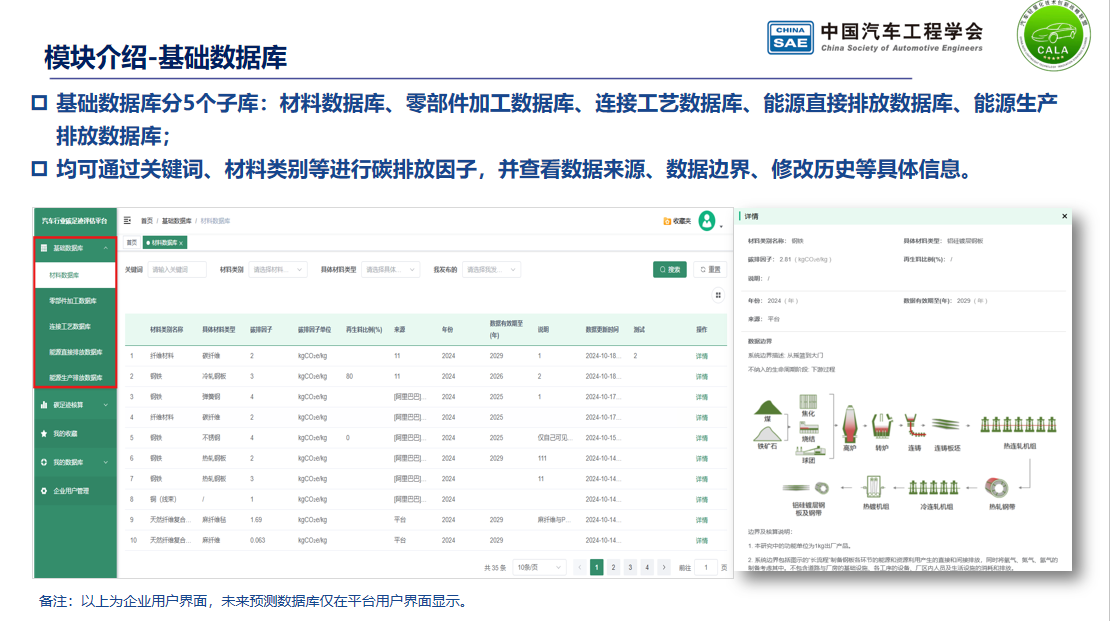 “汽车行业碳足迹评估系统”定位于建设面向汽车产品碳足迹合规研发的“查-算-改”一站式服务平台,支持企业在研发阶段进行碳足迹评估、方案决策及合规改进。系统建设遵循“全链覆盖、共建共享、分步实施、精准实用”原则,1.0版本系统开发了建设了基础数据库、碳足迹核算、碳足迹预测等关键模块,可实现材料、工艺、能源碳足迹因子的查询,不同技术方案的核算、预测及对比,企业数据的提交与发布等功能。 |